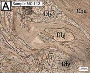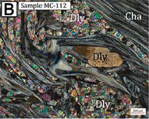 Агрегаты дэлиита (Dly) в чароите (Cha) под микроскопом. Дэлиит имеет высокий рельеф при одном николе и высокие интерференционные окраски в скрещенных николях [Dokuchits et al.,2023] |