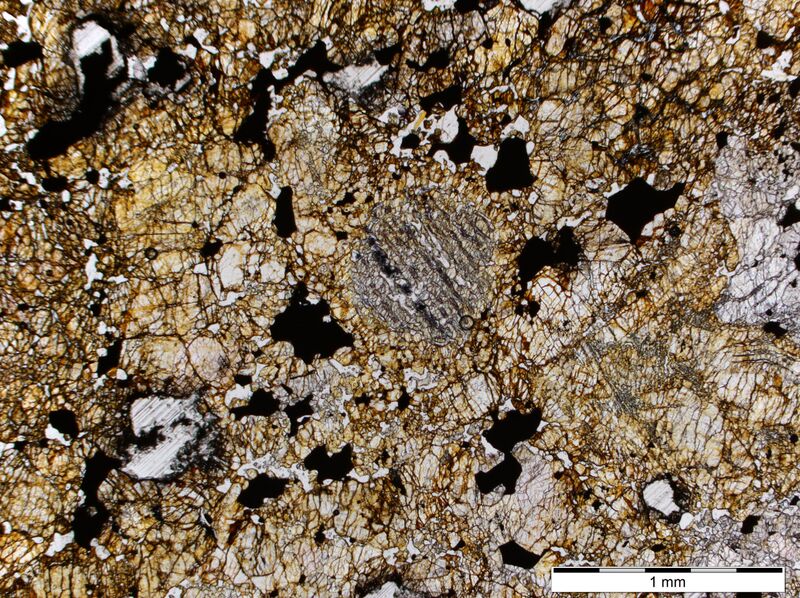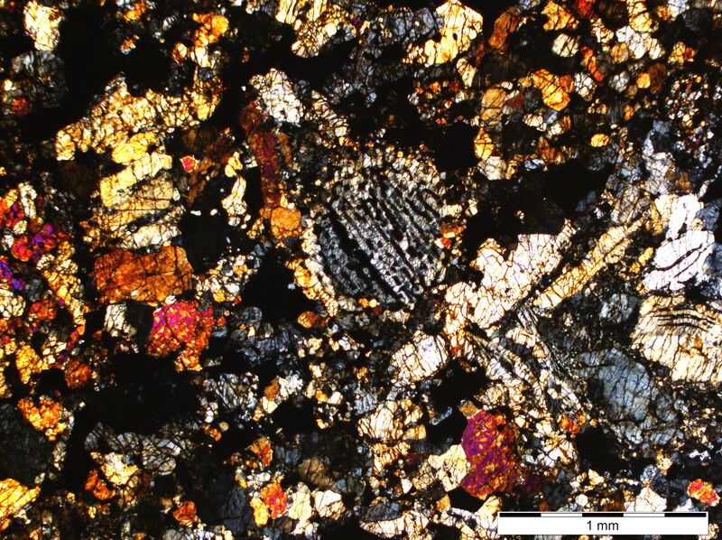 Силикатная часть состоит из оливина Fa25.24±0.6 (N=28) и низкокальциевого пироксена Fs22.8±0.53Wo1.66±0.35 (N=19), плагиоклаза Ab80.2An10.6Or6.3 (N=11), высококальциевого хромистого пироксена En47.8Fs8.1Wo43.9 (N=6), хлорапатита (Cl-5.26 мас.,%, N=5) и меррилита (FeO- 0.54-6.8 мас.,%). Камасит содержит (мас. %, N=8): Fe 92.3, Ni –6.3, Co – 1.45. Троилит близок к идеальной формуле FeS.