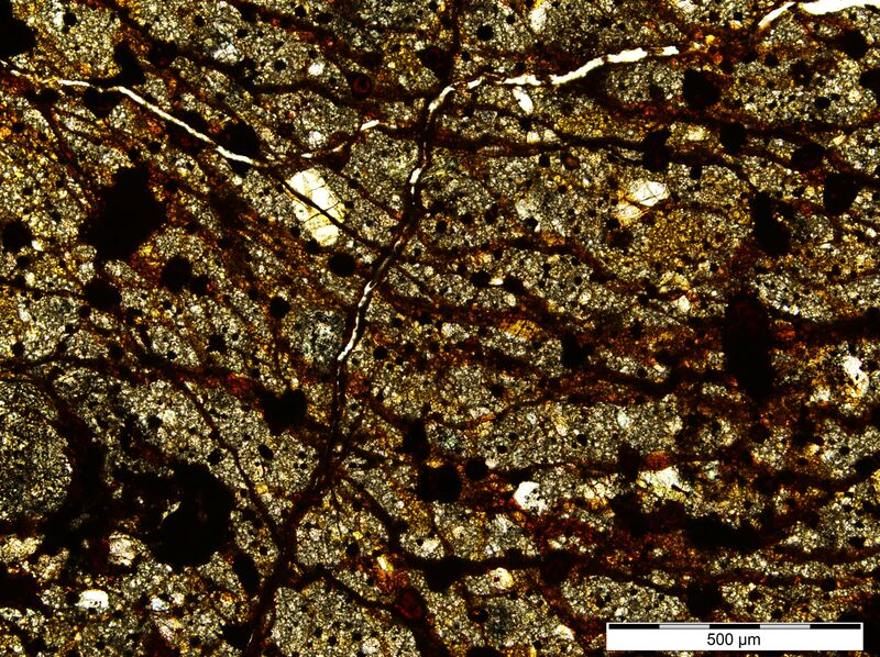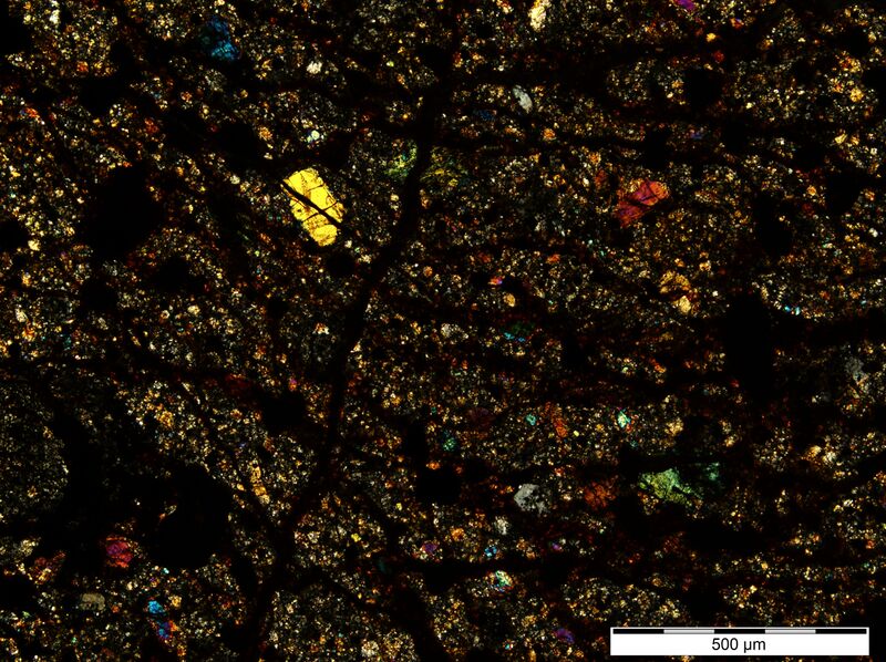 Силикатная часть состоит из оливина Fa18.48±1.12 (N=14) и низкокальциевого пироксена Fs16.1±1.0Wo1.74±0.25 (N=14).