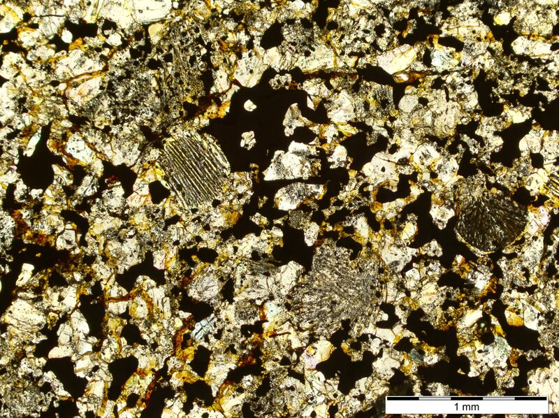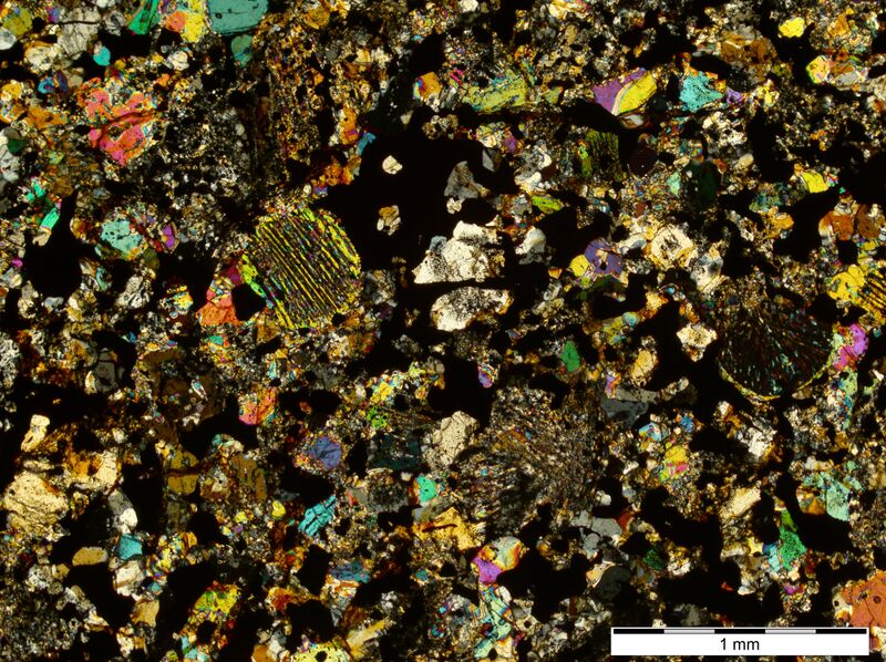 Силикатная часть состоит из оливина Fa18.54±0.39 (N=12), низкокальциевого пироксена Fs16.3±0.6Wo1.43±0.29 (N=13) и плагиоклаза Ab81.8An12.6Or5.5 (N=3). Камасит содержит (мас. %): Fe 93.34, Ni –5.1, Co – 0.5. Тенит содержит 30.55 и 0.24 мас.% Ni and Co соответственно. Троилит близок к идеальной формуле FeS.