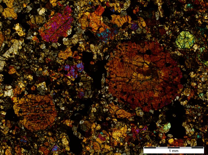 Силикатная часть состоит из оливина Fa25.75±2.22 (N=10) и низкокальциевого пироксена Fs20.2±0.4Wo1.59±0.22 (N=15). Камасит содержит (мас. %, N=4): Fe 93.32, Ni –5.97, Co – 0.71. Тенит содержит 35.54 и 0.26 мас.% Ni and Co соответственно. Троилит близок к идеальной формуле FeS.