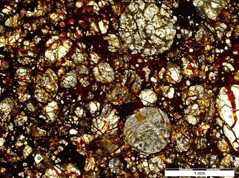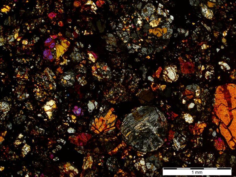 Силикатная часть состоит из оливина Fa18.49±0.47 (N=17), низкокальциевого пироксена Fs16.0±0.6Wo0.94±0.12 (N=7), плагиоклаза Ab84.5An11.8Or4.3 (N=2), высококальциевого пироксена En50.0Fs5.4Wo44.7. Фосфаты представлены Cl-апатитом.Троилит близок к идеальной формуле FeS.