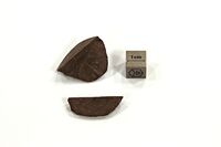 Коллекция Метеориты, №192. Два фрагмента обыкновенного хондрита H5W1S2 (17.5 гр. и 4.1 гр.) с коричневой корой плавления. На спилах ржаво-коричневые с обильной вкрапленностью железа. Регистрационная масса 21.6 гр. Длина экспоната 3 см.