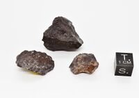 Коллекция Метеориты, №235. Три фрагмента (12.5 г, 5.4 г, 3.6 г) обыкновенного хондрита Chug Chug 112 (Чуг Чуг 112) H6S1W1 с темно- коричневой корой плавления, покрытой белесыми пленками. Размер наибольшего фрагмента 2.5 х 2 х 2 см. Регистрационная масса. Длина экспоната 2.5 см.
