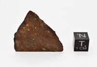Коллекция Метеориты, №240. Срезанный с двух сторон фрагмент (4 х 2.5 х 1.5 см, 23 г) обыкновенного хондрита Chug Chug 110 (Чуг Чуг 110) LL6S4W1 с коричневой корой плавления. С обильной вкрапленностью железа Регистрационная масса. Длина экспоната 4 см.