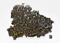 Коллекция Метеориты, №271. Пластина палласита (PMG) Омолон размером 17 х 12 х 0.5 см, заполированная и протравленная кислотой с одной стороны и покрытая эпоксидной смолой с другой. Длина экспоната 17 см.