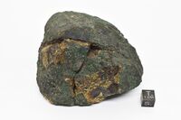 Коллекция Систематическая коллекция, №49259. Грубоблочный кристалл халькопирита с преобладанием скаленоэдра и преимущественным развитием одной грани тетраэдра. Покрыт корочками медной зелени.