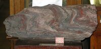 Коллекция Систематическая коллекция, №75953. Гематит чешуйчатый в кальците с прослоями красной яшмы, смятые в складки. Штуф 62х26 см. Длина экспоната 62.0 см.