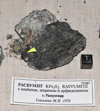 Найден: горизонт 552, Расвумчорр, Хибины, Кольский п-ов, Россия. Расположен на витрине exp56