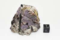 Коллекция Систематическая коллекция, №85049. Сиренев. массив. 5х2.5 см агр. окаймляет сероват. со спайностью паракелдышит (2.5х1 см), натролит (все с включ. магнезиоарфведсонита, ломоносовита, игольчатого эгирина), NaF, серандит. 5.5х5х2 см.