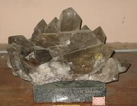 Коллекция Систематическая коллекция, №85124. Штуф. Друза крупных 30-40 см. полупрозрачных дымчатых кристаллов покрытых по лежачему боку 2-3 мм желтоватыми прозрачными кристаллами шабазита. 59х42х22 см. Длина экспоната 59.0 см.Размер минерала 25.00 см.
