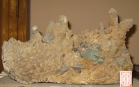 Коллекция Систематическая коллекция, №85327. Друза молочно-серых непрозрачных зональных 4-12 см кристаллов с отдельными зонально окрашенными {111} и {111}{100}??? грубоблочными зелено-фиолетовыми кристаллами флюорита и кварц-сидеритовой присыпкой по лежачему боку. 40х29х23 см. Длина экспоната 40 см.Размер минерала 10 см.