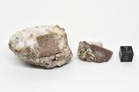 Коллекция Систематическая коллекция, №85366. Розовый мелкочешуйчатый - псевдоморфоза по пластинчатому кристаллу (2 см фрагмент) вуоннемита в микроклиновой "рубашке", в крупнозернистом натролите. 5х4х2.5 см.