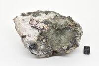 Коллекция Систематическая коллекция, №85895. Псевд. по 3.2х1 см кристаллу ломоносовита (?) с радиально-волокнистым эгирином в натролитизированном уссингите; 0.7 см розетки темно-коричневого нордита, КПШ, желтый продукт измененного стенструпина. 11.5х6х6 см