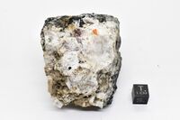 Коллекция Систематическая коллекция, №85961. Белый полупрозрачный 1.5х1.5 см реликт кристалла с корочкой замещения белым зернистым эпидидимитом и розовым тугтупитом в полевошпатовом прожилке на породе; мурманит, астрофиллит, эгирин. 7х4.8х4 см.