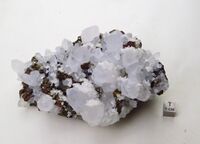 Коллекция Систематическая коллекция, №86065. 0.3-1.2 см тетраэдрические с матовыми гранями покрытыми пленкой побежалости блочные кристаллов в срастаниях с пентагондодекаэдр. кристаллами пирита и октаэдрами сфалерита, на друзовой корке короткопризматических полупрозрачных кристаллов кварца и присыпкой 2-5 мм скаленоэдрических кристаллов кальцита по лежачему боку. 14х9.5х6 см.