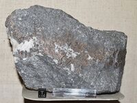 Коллекция Систематическая коллекция, №87330. Изометричные зерна до 5 мм. и их агрегаты с кальцитом в центре жилы, зальбанды которой образова ны скуттерудитовым агрегатом. Длина экспоната 18.0 см.