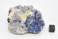 Коллекция Систематическая коллекция, №87463. 2х0.5 см ксеноморфное грубозернистое выделение с белым окристаллизованном в сторону серы кальцитом в грубозернистом сером кальците с обильными зернами лазурита и мариалита?, с отдельными кристаллами пирита. Образец 7 х 6 х 2.5 см. Длина экспоната 7 см.Размер минерала 2 см.
