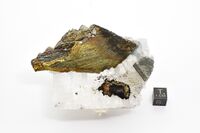 Коллекция Систематическая коллекция, №87936. Ромбовидный уплощенный скелетный кристалл халькопирита тетраэдро-скаленоэдрического габитуса размером 7х4 см в гигантозернистом кальците.