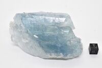 Коллекция Систематическая коллекция, №88012. Фрагмент 10х6х2 см.(вероятно часть ограненной дипирамидами hkl вершины и часть призматического пояса граней hk0) бледно-голубого кристалла с вросшими вблизи его поверхности молочно-белыми длиннопризматическими, завершенными с обоих вершин кристаллами кварца до 1.5х0.3 см. и бесцветными кристаллами датолита от 0.05 до 1.3 см. Длина экспоната 10 см.