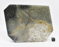 Коллекция Систематическая коллекция, №88027. Скопления желтых 1-5 мм. зерен с квадратными и прямоугольными сечениями в мелкозернистом нефелине и в кварц- полевошпатовом обособлении в нефелине. Полированная пластина 15х12 см. Длина экспоната 15.0 см.