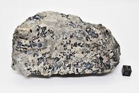 Коллекция Систематическая коллекция, №88413. Каймы замещения вокруг таблитчатых кристаллов синего корунда и нефелин-полевошпатовом пегматоиде с содалитом,канкринитом,монацитом Длина экспоната 15.0 см.