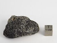 Коллекция Систематическая коллекция, №88752. Интерстициальные выделения минералов ЭПГ в крупнозернистом агрегате хромшпинелидов Длина экспоната 4.5 см.