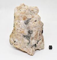 Коллекция Систематическая коллекция, №89620. Изометричные серые выделения до 2см, приуроченные к белым альбитовым прожилкам в гигантозернистом ридмержнеритовом агрегате, включающем крупные (0,3-1.5см) изометричные зерна эвдиалита и частично замещенного оксидами марганца пектолитом. Вблизи выделений шибковита зерна бледнорозового дихроирующего нордита и различимые визуально только по люминесценции в коротком ультрафиолете выделения лейкофана и гиалотекита (голубоватофиолетовые и голубые цвета соответственно). Длина экспоната 17.0 см.