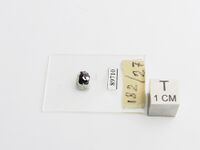 Коллекция Систематическая коллекция, №89710. Почковидные выделения серебра размером до 0,5 мм на скелетных кристаллах сперрилита размером 3х4 мм. Длина экспоната 0.5 см.