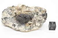 Коллекция Систематическая коллекция, №89757. Скол радиально-волокнистого сферолита графита 2см с толстотаблитчатыми кристаллами зеленовато-желтоватого апатита 3-4мм в массивном мелкокристаллическом натролите с обильным реликтовым игольчатым эгрином и отдельными зернами микроклина. Образец 7 х 4 х 2.5 см. Длина экспоната 7.0 см.Размер минерала 2.00 см.