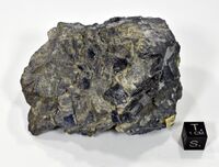 Коллекция Систематическая коллекция, №89770. Друзовый агрегат блочных расщепленных матовых кристаллов галенита до 2,0см; с кварцем. Длина экспоната 8.0 см.Размер минерала 2.00 см.