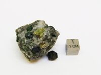 Коллекция Систематическая коллекция, №89779. Изумрудно-зеленые ромбододекаэдрические кристаллы до 0,8см в жильном кварце с пирротином. Длина экспоната 4.0 см.Размер минерала 0.80 см.