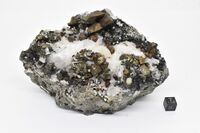 Коллекция Систематическая коллекция, №89814. Друза тетраэдрических кристаллов халькопирита в кальцитовой полости (кальцит вытравлен) среди шестоватых кристаллов - амфиболовой псевдоморфозы по геденбергиту. Длина экспоната 13.0 см.Размер минерала 3.00 см.