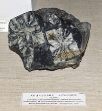 Коллекция Систематическая коллекция, №89840. Секториальные ромбовидные (8см по ребру) сечения андалузита (хиастолита) на полированном срезе слюдяного сланца. Длина экспоната 15.0 см.Размер минерала 8.00 см.
