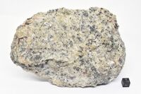 Коллекция Систематическая коллекция, №91681. Серовато-зеленый крупнозернистый агрегат в составе содалитового сиенита. С мелкой вкрапленностью лопарита-(Ce) и виллиомита. Яркая оранжевая люминесценция в длинноволновом ультрафиолете. Длина экспоната 17.0 см.