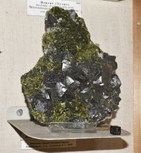 Коллекция Систематическая коллекция, №92553. Друза черных блестящих кристаллов магнетита размером до 2см с расщепленными кристаллами эпидота размером до 1,5см. Длина экспоната 18.0 см.Размер минерала 2.00 см.