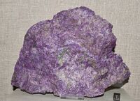 Коллекция Систематическая коллекция, №93168. Сиреневые плойчатые массивные агрегаты стихтита с зеленым серпентином. Длина экспоната 17.0 см.