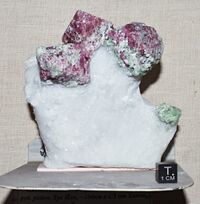 Коллекция Систематическая коллекция, №93215. Три октаэдрических кристалла красной шпинели размером около 3.5см с вростками зеленого паргасита на белом мраморе. Длина экспоната 12.0 см.Размер минерала 3.50 см.