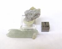 Коллекция Систематическая коллекция, №93328. Бесцветный сероватый призматический столбчатый кристалл стронцианита размером 5х1см на барите. Длина экспоната 5.0 см.Размер минерала 5.00 см.