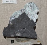 Коллекция Систематическая коллекция, №93332. Бледно-голубой с сероватыми пятнами скрытокристаллический агрегат талька на тонкозернистом хромите. Длина экспоната 19.0 см.