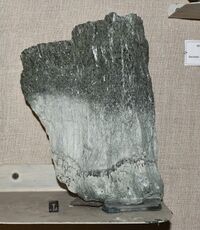 Коллекция Систематическая коллекция, №93333. Зеленовато-белый до бутылочно-зеленого тонковолокнистый зональный агрегат актинолита. Длина экспоната 24.0 см.