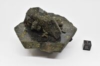 Коллекция Систематическая коллекция, №93567. Сросток таблитчатых пинакоидального габитуса кристаллов темно-зеленого эпидота размером до 8см. Часть граней присыпана мелкими кристалликами фисташкового эпидота и титанита. Длина экспоната 8.0 см.Размер минерала 8.00 см.