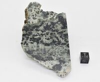 Коллекция Систематическая коллекция, №94068. Халсит образует скопления неправильной формы в везувиан-пироксеновом кальцифире. Длина экспоната 11.0 см.