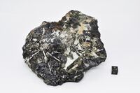 Коллекция Систематическая коллекция, №94608. Агрегат кристаллов Ti-андрадита (до 9 см), длиннопризматичского апатита (длиной до 4 см), нефелина (до 3х2 см) и призматическиого диопсида (до 4х0.7 см). Длина экспоната 15.0 см.Размер минерала 9.00 см.