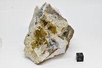 Коллекция Систематическая коллекция, №95174. Желтые прозрачные пластинчатые и призматические кристаллы сфалерита в кавернозном альбите. Длина экспоната 10 см.Размер минерала 5.00 см.
