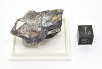 Коллекция Систематическая коллекция, №95277. Сростки очень мелких сильно блестящих красно-коричневых призматических кристаллов илирнейита в трещине сульфидно-теллуридной руды c гесситом, петцитом, золотом, кварцем, халькопиритом. Длина экспоната 4.0 см.