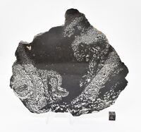 Коллекция Систематическая коллекция, №95872. Участки густой вкрапленности самородного железа (около 70 %) в виде удлиненных шлиров и скоплений в мелкозернистом черном долерите. Выделения самородного железа достигают 1 см, часть их окружена каймой магнетита 1-2 мм. В участках, обедненных железом, долерит содержит вкрапленность пирротина, размером до 6 мм и белого минерала (возможно цеолита) до 7 мм. Пластина размером 17х15х0,8 см отполирована с одной стороны. Длина экспоната 17.0 см.Размер минерала 1.00 см.