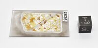 Коллекция Систематическая коллекция, №96262. Прозрачно-полированный шлиф грубозернистой паралавы, состоящей из андрадита-шорломита, геленита, ранкинита, волластонита и куспидина с зернами плиниусита размером около 1 микрона с вальстромитом, гуримитом, теноритом и вторичными кальциевыми гидросиликатами. Котип. Полированный шлиф 3 х 2 см. Длина экспоната 3 см.