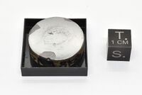 Коллекция Систематическая коллекция, №96276. Зерна феррипербёита-(La) размером до 1 х 0.5 мм и пёрбеита-(La) до 0.4 мм в бастнезит-тернебёмитовом овоиде с фторбритолитом-(Ce), монацитом-(La) и гейландитом-Ca. Овоид 12 х 9 мм в эпоксидной шашке диаметром 2,5 см. Голотип для феррипербёита-(La) и пёрбеита-(La). Длина экспоната 1 см.