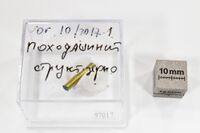 Коллекция Систематическая коллекция, №97017. Черное зерно размером менее 0.1 мм походяшинита на циллиндрическом металлическом держателе. Оригинал структурного исследования, фрагмент голотипа.